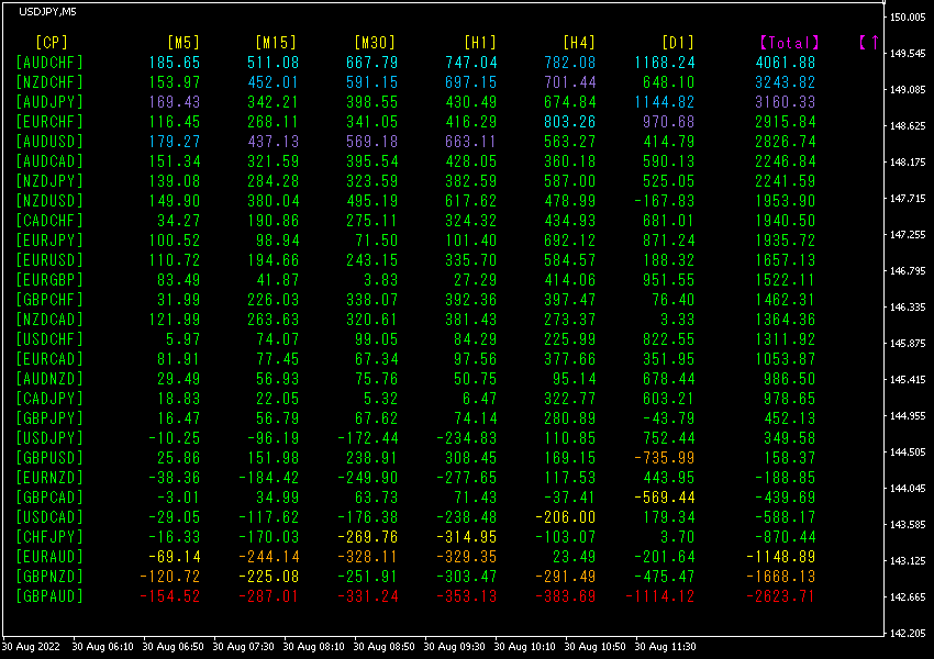 Total数値で降順に並べ替えしています。一番上の行にあるAUDCHFが、[M5]、