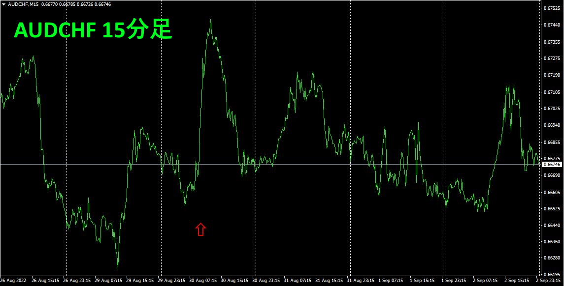 下向きの赤矢印がスクリーンショットを撮影した位置です。赤矢印の位置から急騰しています。約70PIPSの利益が得られました。