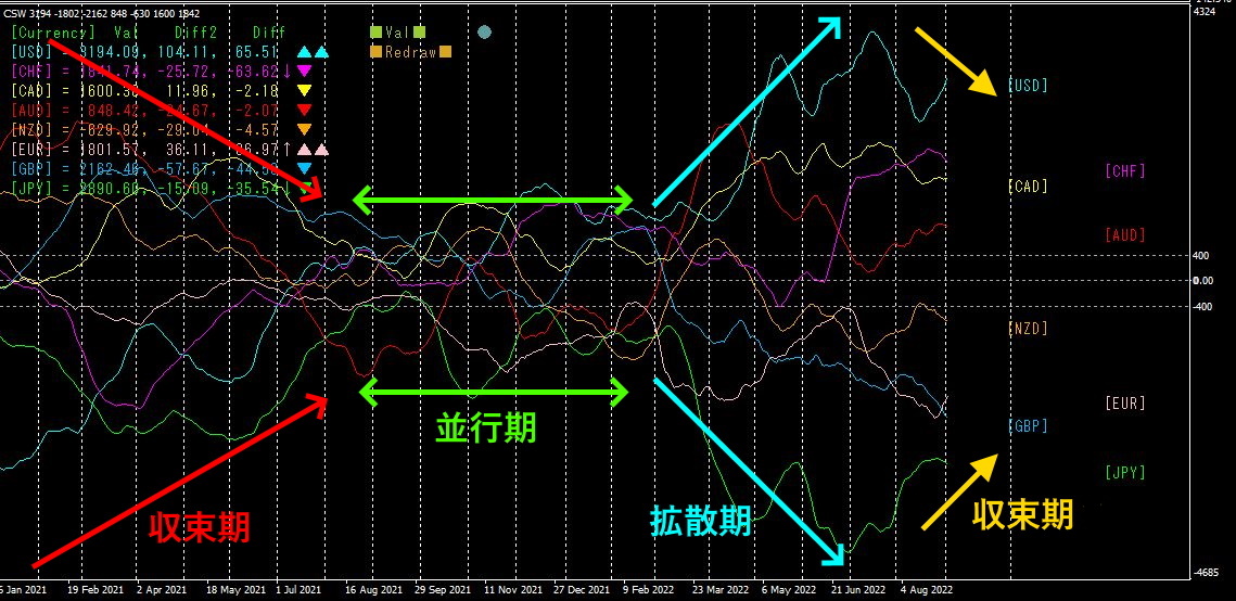全体の大局的流れとしては、収束期 → 並行期 → 拡散期 と続いており、現在は拡散期から収束期に向かっています。