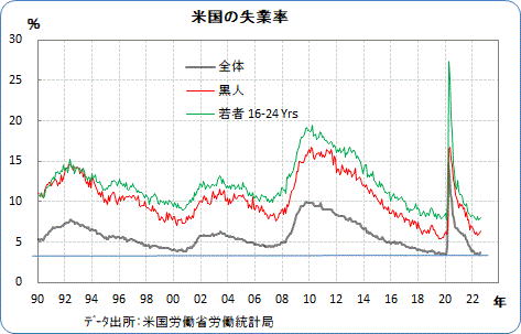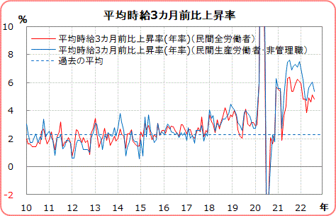 平均時給は前月比0.3%上昇、前年同月比は5.2%上昇。生産労働者・非管理職の前年同月比は6.1%上昇。賃金インフレにピークアウト感があるが、FRBは前年同期比で3%程度に抑えたいだろうから、道のりはまだ長い。