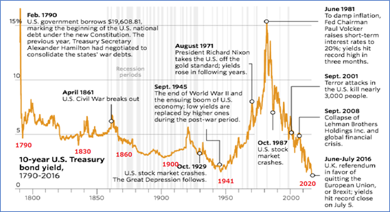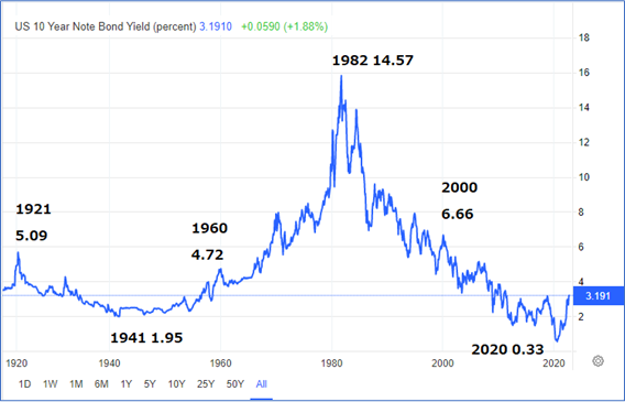 米国の長期金利にはおよそ80年、そしてその1/2である40年(レンジ33~47年)毎に重要なボトムに到達している。その歴史的ボトムは1790年と1830年前後、1901年、1941年1月、1986年8月、そしておそらく2020年3月の0.33%であった。また20年毎に重要なトップとボトムを付ける傾向があるようだ。次の重要なトップは2040年前後であろう。