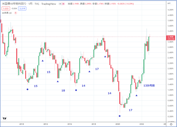米国金利の20年(17~23年)サイクルは4つか6つの3~5年サイクルからなるものと想定される。前回の3~5年サイクルは4年で2016年7月にボトムをつけた。