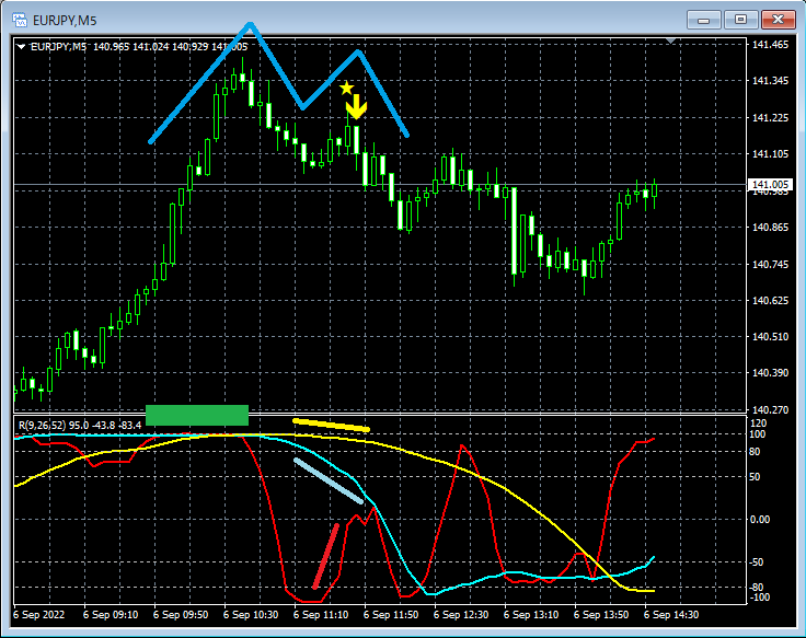 上の例では、ダブルトップの左側の山でRCI3重天井(緑の四角)の形まで上昇している。