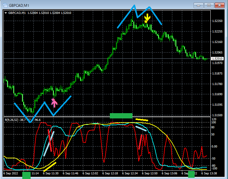 上の例では、ダブルボトムの左側の谷でRCI3重底(緑の四角)の形まで下げている。