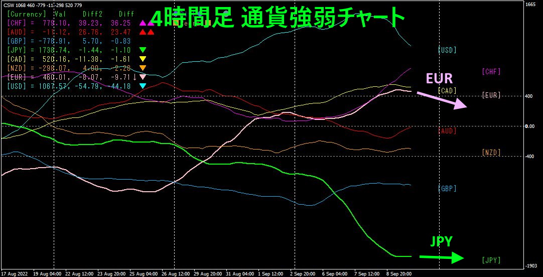 ピンク色がEUR、緑色がJPYです。最も弱いJPYだったのですが、ほんの少し下向きですが、ほぼ水平方向に向かっています。一方EURは、JPYより上に位置していますが、下向きの角度がJPYよりも急になっています。今後の動向としては、EURJPYはやや下げ方向に向かうものと考えられます。