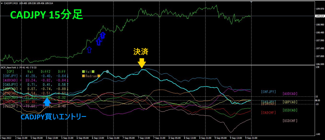 上半分は、CADJPYの15分足チャートです。上半分の青色矢印は、「28通貨ペア一覧インジケータ」のアラート位置を示します。下半分は、「8CP見える化インジケータ」です。水色太線のグラフがCADJPYに相当します。