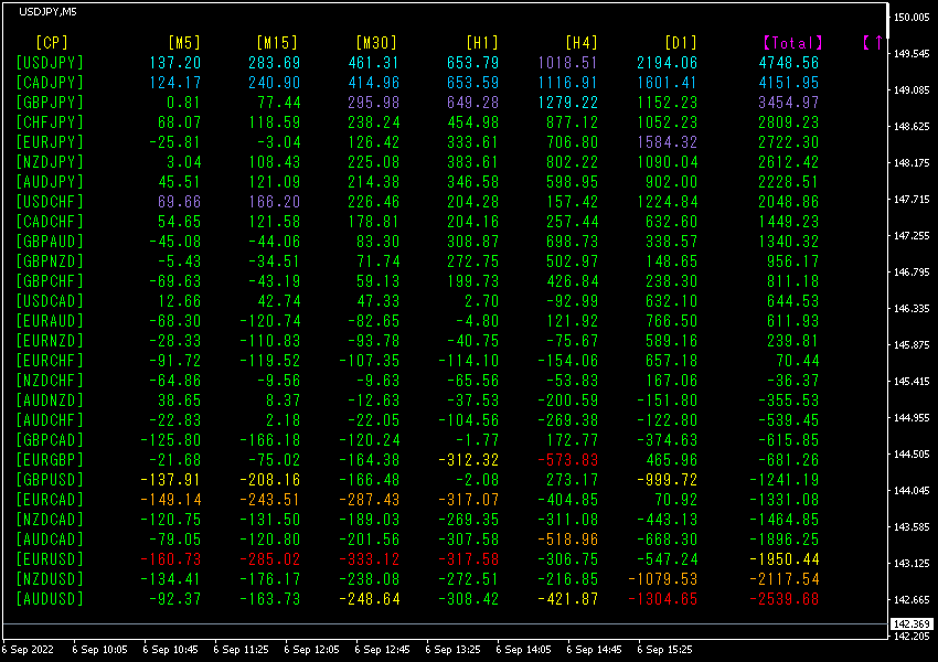 Total数値で降順に並べ替えしています。一番上の行にあるUSDJPYが、[M5]、