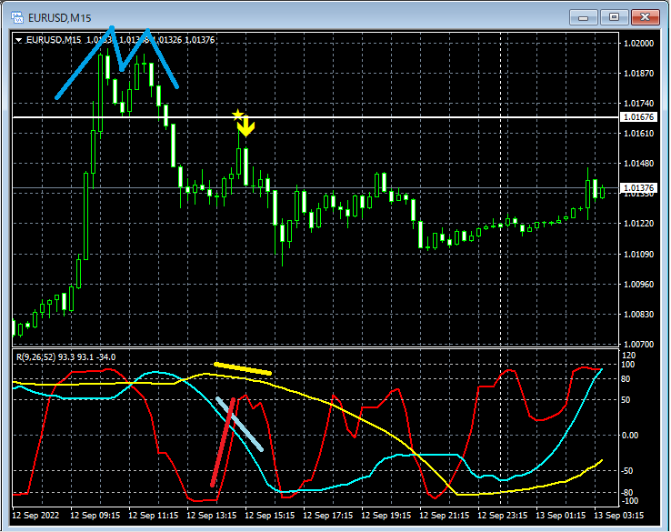 上のチャートを見ると、ダブルトップ形成時にはRCI52が明確な下げには転じていないが、ネックライン付近まで戻してきたときには、RCI26とRCI52がともに下げに転じており、RCI9のみ上昇という場面となっている。ここで、RCI9が下げに転じればRCI3本そろって下げのとても弱い形となることも想定される局面である。