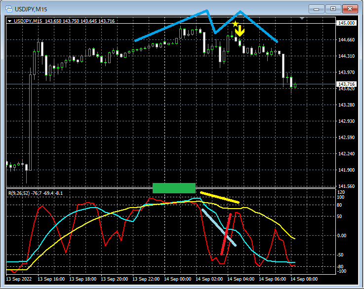 『RCI3本ライン+mBDSR』~ドル円 5分足の次は15分足でダブルトップ~