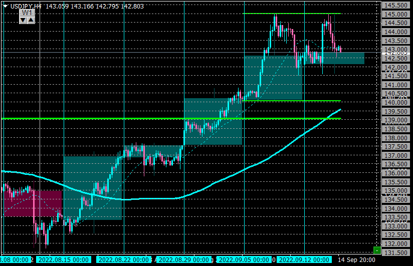 現在のレート143.0は、天井145.0からかなり下げた位置にあり、またネックラインも近くショートはリスク高いか?