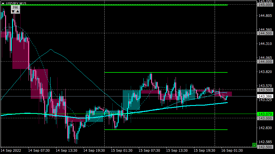 現在のレート143.50は、141.50からの押し目買いと145.0からの戻り売りの中間点。