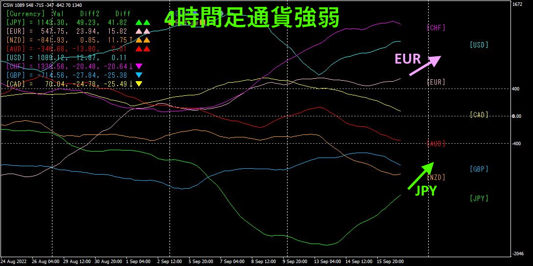 ピンク色がEUR、緑色がJPYです。最も弱かったJPYですが、やや上向きになってきました。一方EURは、JPYより上に位置していて、少しだけ上向きになっています。上向きの角度がJPY>EURなので、今後の動向としては、EURJPYはやや下げ方向に向かうものと考えられます。