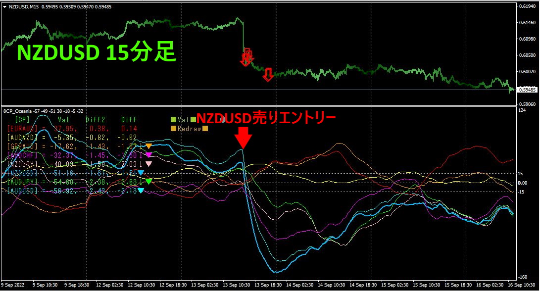上半分は、NZDUSDの15分足チャートです。上半分の赤色矢印は、「28通貨ペア一覧インジケータ」のアラート位置を示します。下半分は、「8CP見える化インジケータ」です。水色太線のグラフがNZDUSDに相当します。