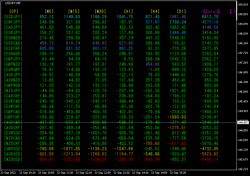 Total数値で降順に並べ替えしています。一番上の行にあるUSDJPYが、[M5]、[M15]、[M30]、[H1]、[H4]、[Total]が水色になっています。[D1]も紫色で、Totalの数値が6812.70と大きくなっているので、USDJPYに強い上昇トレンドが発生していることが読み取れます。