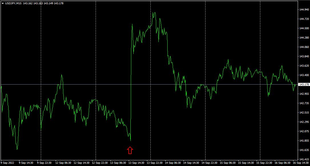 上向きの赤矢印がスクリーンショットを撮影した位置です。赤矢印の位置で、極端にレートが跳ね上がっていますが、これは、米国の消費者物価指数の発表によるものです。