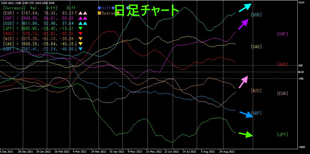 日足の通貨強弱グラフ、4時間足の通貨強弱グラフを順に見ていくことにします。