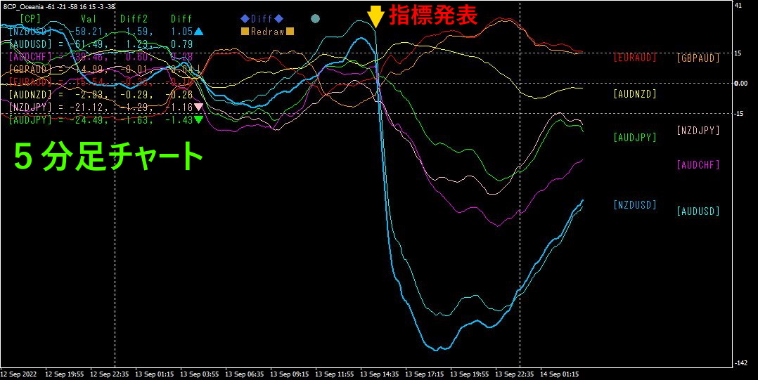 下の図は、発表前後の「8CP見える化インジケータOceania」の5分足チャートです。水色太線のグラフがNZDUSDです。