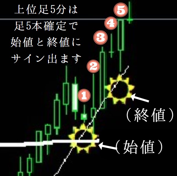 上位足のサインの点灯は、下の図のように始値と終値のローソク足にサインが2つ点灯します。