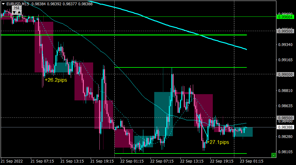 昨日はH1MAまでは戻らなかったが、朝のシナリオ通りレジスタンスになっていたレート0.990で反転。