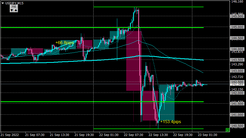 140.50のサポートでM15レベルの下ヒゲが出たのでイグジット。+150pipsほど。