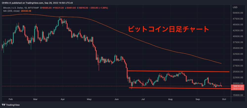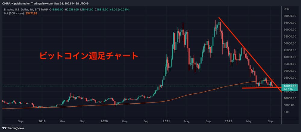 昨年の高値からの赤線と水平の赤線で囲まれたところに価格が収束している状況と言えます。