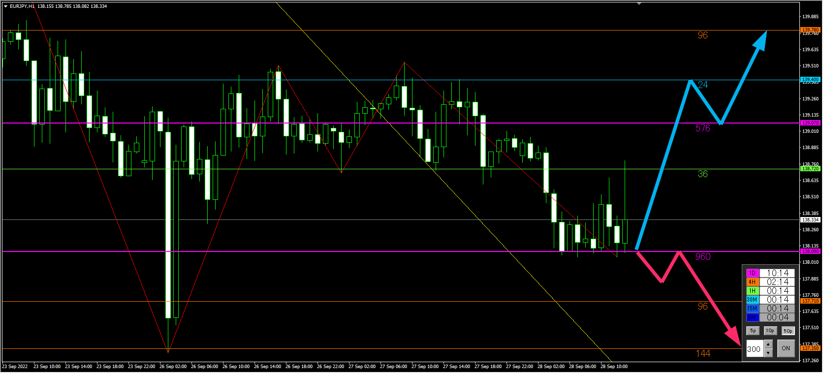 上の数値575紫ラインを日足確定時にローソク足の実体が突き抜ければ上昇の流れのシナリオを想定しています。