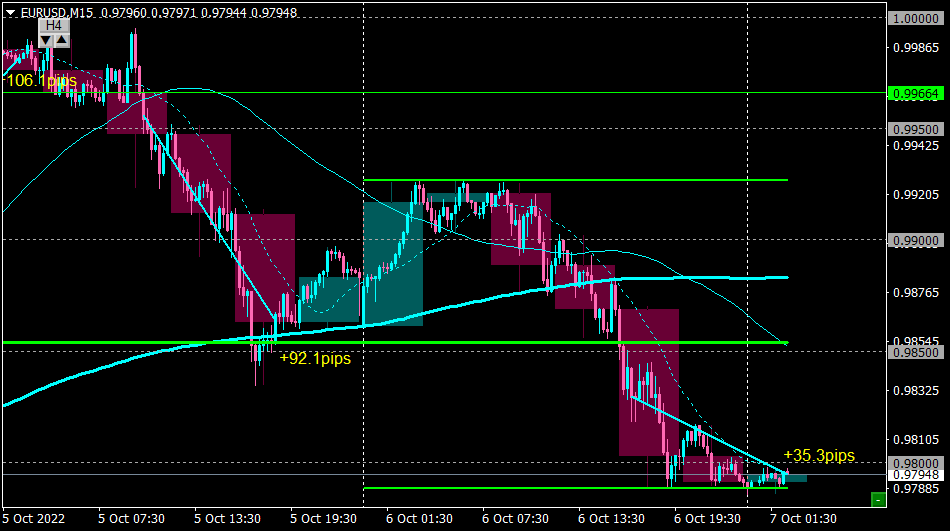 0.9850を割ったタイミングで、シナリオ通りショートし朝までホールド。+35pips