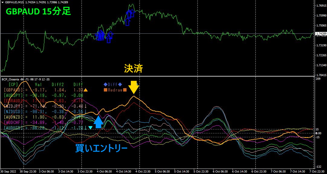 上半分は、GBPAUDの15分足チャートです。上半分の水色矢印は、「28通貨ペア一覧インジケータ」のアラート位置を示します。下半分は、「8CP見える化インジケータ」です。橙色のグラフがGBPAUDに相当します。