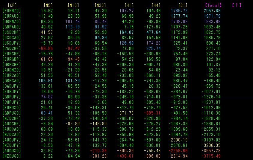 Total数値で降順に並べ替えしていますが、どの通貨ペアもアラート発生条件に達していません。傾向としては、EURNZDが全体的に上昇、NZDUSDが下降しています。通貨強弱的にNZDが弱くなっているようです。