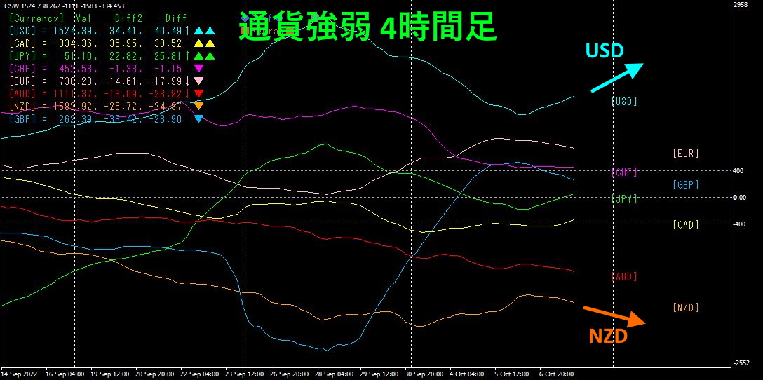 やはり、NZDが最も弱く、しかも下向きに推移しています。USDが最も強く、上向きになっていますので、NZDUSDが下落するのは当然の結果と言えます。