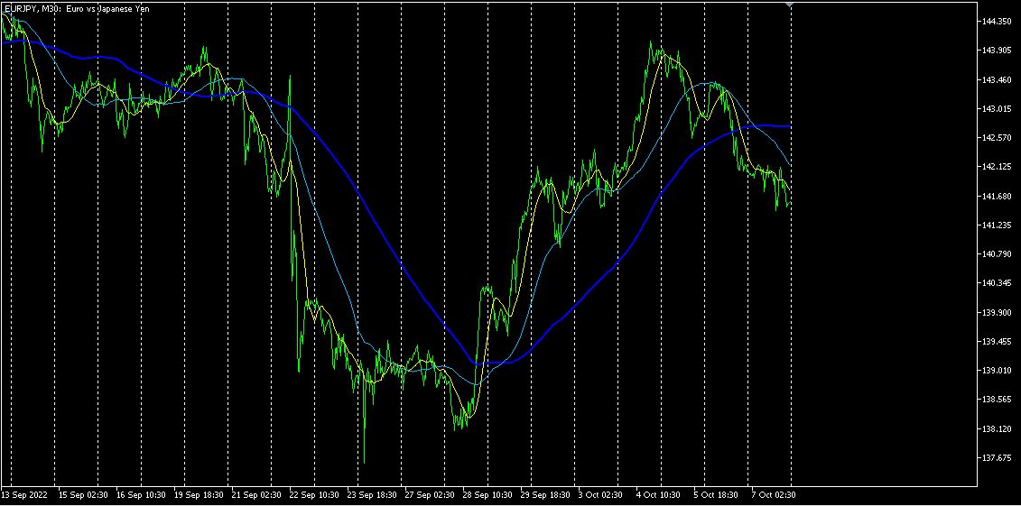 ピンク色がEUR、緑色がJPYです。週の後半からEURは下向き、JPYは上向きに変わってきました。この傾向が続くのであれば、EURJPYは下降に向かうと想定されます。