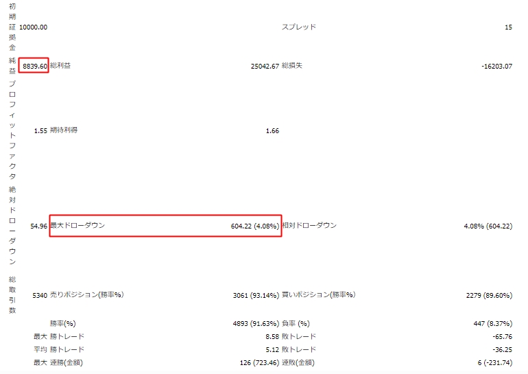 0.1ロット、最大保有ポジション3に対しての最大ドローダウンが604ドルとDDが低めなのが嬉しいですね。