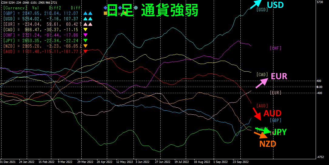 相変わらず最も強い通貨はUSDで、しっかり上を向いています。EURとGBPは上向きになってきました。一方、AUDとNZDが下向きになっています。先週もAUDとNZDは下向きでした。