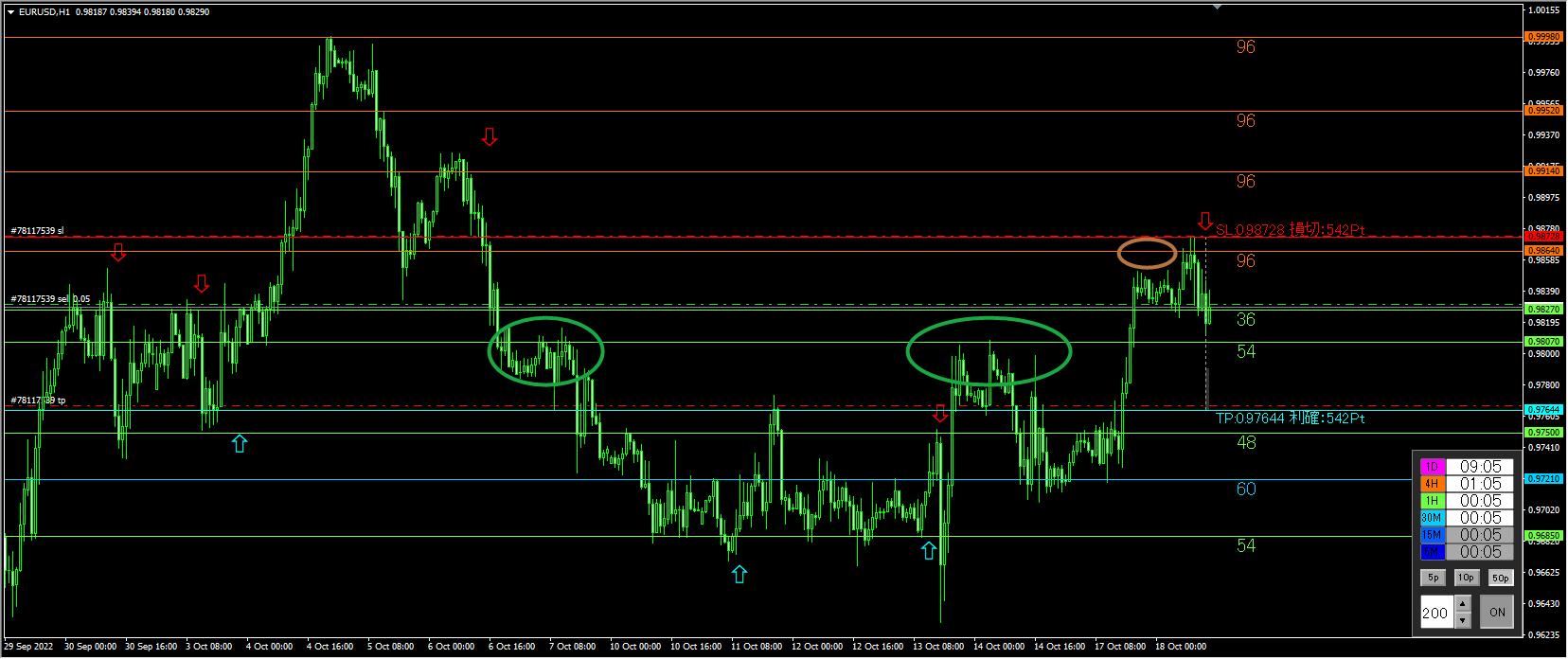 そして、直下緑ライン(54)は1時間足で意識されるレジサポライン。直近では抵抗なくスッと上昇していますが、緑丸付近では緑ラインに反応している感じです。