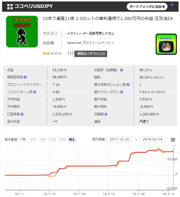 現在は「ココペリUSDJPY」がダントツ人気なのですが、katamike氏の他のEAも成績が良いので、どれにしようか迷っている方もいるのではないでしょうか。