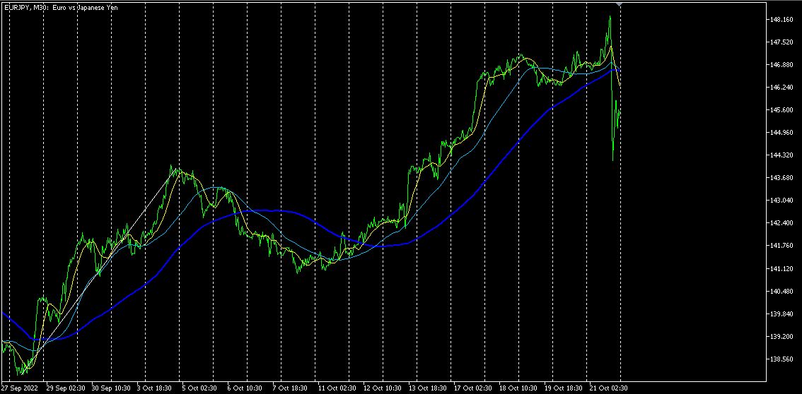 EURは水平からやや上向き、JPYは下向きで下落中です。(円安の勢いが止まりません。)この結果、EURJPYは上昇に向かうと想定されます。