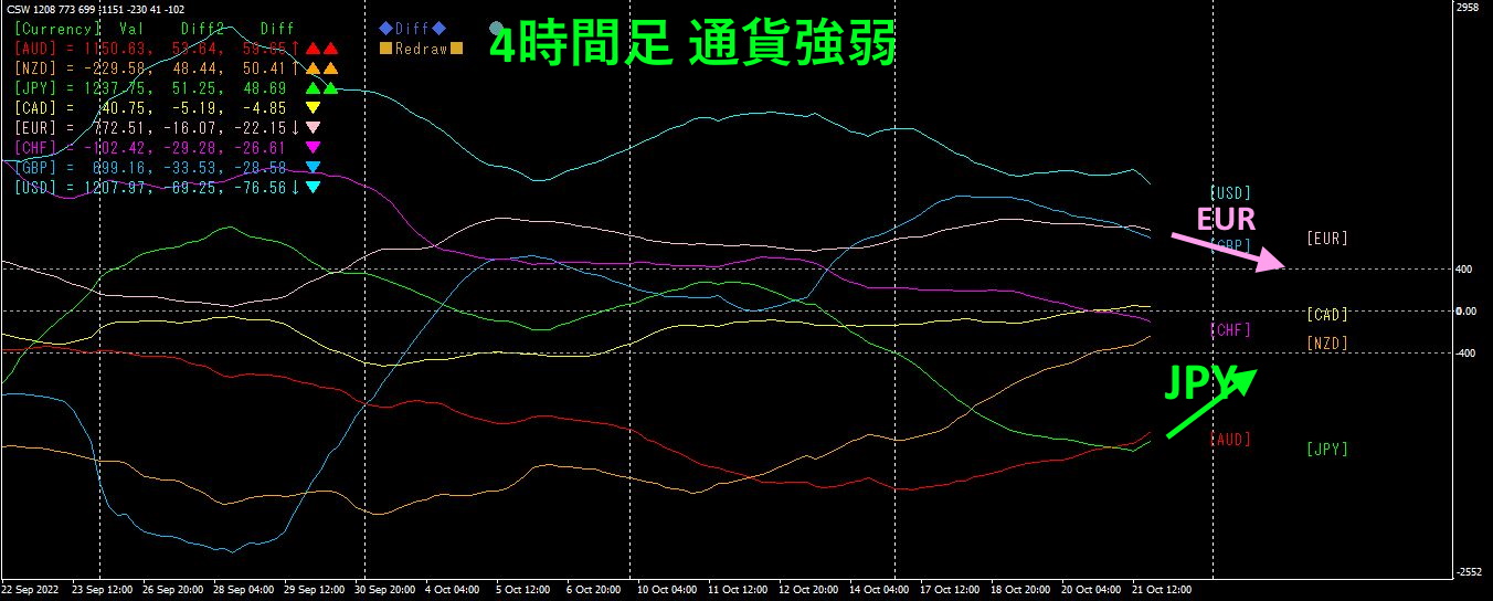 ピンク色がEUR、緑色がJPYです。EURは水平からやや下向き、JPYは下向きに下落していたのですが、為替介入で上向きました。為替介入の影響がどこまで有効に働くのか不明なので、方向感が読めません。ただし、基本円安の傾向は為替の単独介入だけで変わるはずもなく、しばらくしたら元に戻るのが自然の動きだと思います。