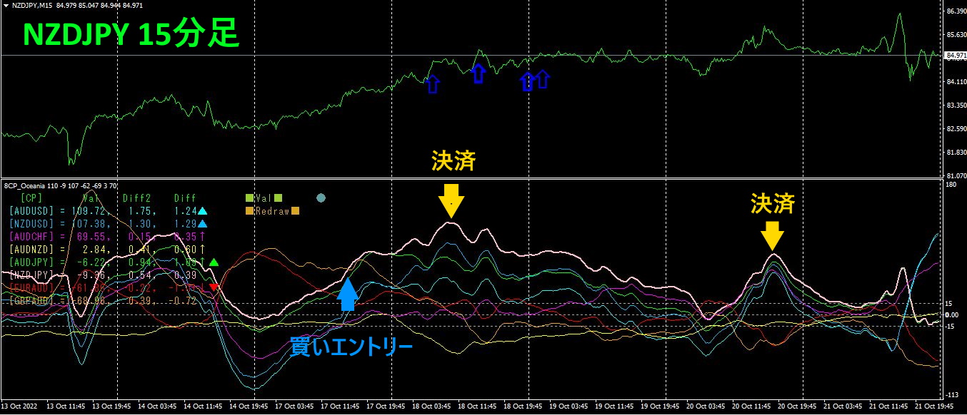 上半分は、NZDJPYの15分足チャートです。上半分の水色矢印は、「28通貨ペア一覧インジケータ」のアラート位置を示します。下半分は、「8CP見える化インジケータ」です。ピンク色のグラフがNZDJPYに相当します。