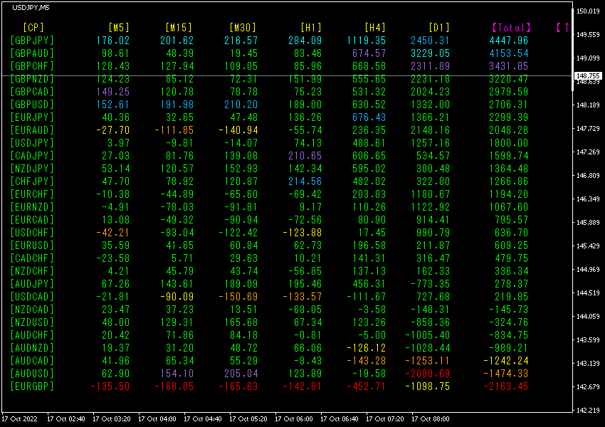 Total数値で降順に並べ替えしています。一番上の行にあるGBPJPYが、[M5]、
