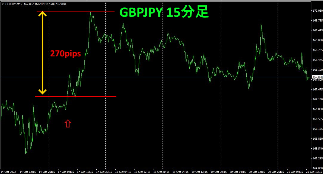 上の図は、GBPJPYの15分足チャートです。赤色の縦線がスクリーンショットを撮影した位置です。ここから買えば、約270pipsの利益が得られました。
