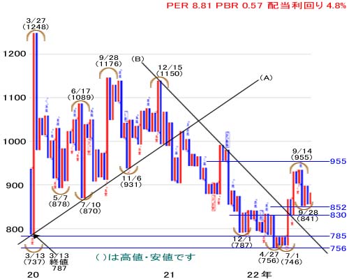 コロナ相場前の2019年10月30日の高値1366円からの下げで、2020年3月13日に737円(終値787円)で底打ちとなり、ここから急反発となって3月27日に1248円まで上昇しました。その後、5月7日に878円まで下げて、6月17日に1089円まで反発し、7月10日に870円まで下げて、もみあい9月28日に1176円の高値をつけました。ここをピークに11月6日に931円まで下げて反発し、12月15日の1150円を2番天井にして、下降トレンド(B)へ転換しました。この下降トレンド(B)の中で、今年(2022年)の4月27日の756円、7月1日の746円と2点底をつけて、9月14日に955円まで上昇して9月28日に841円の安値をつけてもみあっているところです。