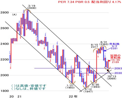 コロナ相場前の2020年1月6日の高値2822円からの調整で、2020年3月13日の1836円、8月3日の1857円を2点底にして上昇に転じ、2021年3月19日に2830円の年初来高値をつけました。ここから下降トレンド(A)へ転換しました。この下降トレンド(A)の中で2022年1月27日の1903円、5月12日の1847円、6月20日の1893円と3点底をつけて上放れとなりました。終値ベースで8月15日の2317円まで急騰し、ここから順上げの4段上げと8月31日の2365円でピークとなり、9月2日に2281円で「売転換」となって、10月13日に2069円まで下げて反発し、もみあいとなって10月26日に2189円で短期の「買転換」が出現しています。