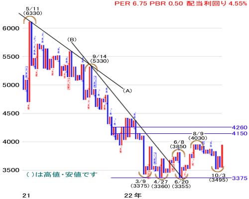 コロナ相場の急落で2020年3月17日に2810円で底打ちとなり、もみあったあと7月31日の2940円を2番底にして急角度の上昇トレンドを形成し、2021年5月11日に6330円の高値をつけ、下降トレンド(A)→(B)へと転換しました。この下降トレンドの中で2022円3月9日の3375円、4月27日の3360円と2点底をつけて、下降トレンド(B)を上にぬけて6月8日に3850円まで反発し、ここから6月20日に3355円まで下げて3点底を形成し、8月9日に4030円まで上昇しました、ここからの調整で10月3日の3495円まで下げて、もみあいとなり落ち着きどころを探しています。本日は大幅上昇となりました。押し目を待つところです。