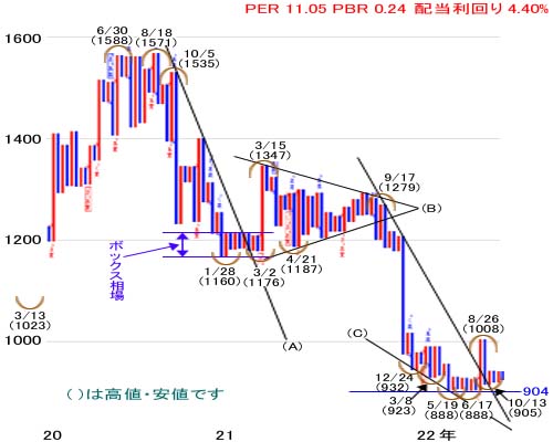 コロナ相場の下落で2020年3月13日に1023円の安値をつけて反発となり、6月30日に1588円の高値をつけてもみあい、8月18日の1571円を2番天井にして、10月5日の1535円を高値に短期の下降トレンド(A)に転換しました。この中で2021年1月28日に1160円まで下げて横もみのボックス相場となり、3月2日の1176円を安値に上放れとなって3月15日に1347円の高値をつけ、ここで三角保ち合い(B)となり、この中の煮詰まったところで9月17日の1279円を高値に下放れとなり、12月24日に932円の安値をつけ、ここからゆるやかな短期の下降トレンド(C)となりました。この安値圏での下降トレンド(C)の中で、2021年12月24日の932円、2022年3月8日の923円、5月19日の888円と順下げの3点底となり、ここで5月17日の888円とダブル底をつくって横もみの終値でのボックス相場となって上放れし、8月26日に1008円と年初来高値をつけて反落し、10月13日の905円を安値にもみあっています。