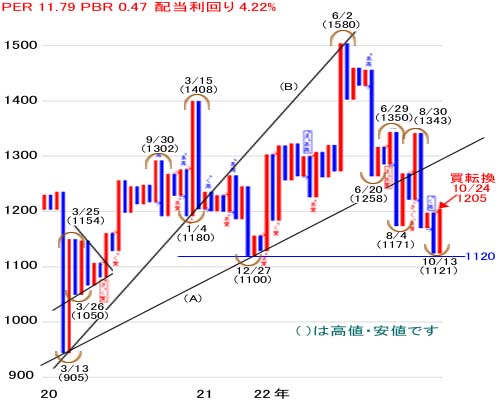 コロナ相場の下落で2020年3月13日の905円の底打ちから上昇トレンド(A)を形成し、この中で2021年1月4日の1180円を結ぶ上昇トレンド(B)を形成しました。この上昇トレンド(B)の中で、2020年3月25日の1154円を高値とし、3月26日の1050円を安値とする三角保ち合いを上放れし、9月30日に1302円まで上昇して、2021年1月4日に1180円まで押し目を入れ、3月15日に1408円の高値をつけました。ここを当面のピークに調整入りとなり、12月27日に1100円まで下げて上昇トレンド(A)に差ポートされ、2022年6月2日には1580円と年初来高値をつけました、ここをピークに6月20日に1258円まで下げて6月29日に1350円まで反発し、再下落となって8月4日に1171円まで下げて8月30日に1343円まで反発し、2番天井をつくって10月13日に1121円まで下げました。ここを当面の安値にして10月24日に1205円で「買転換」となっています。1100円と1121円の2点底をつけて反発している形です。