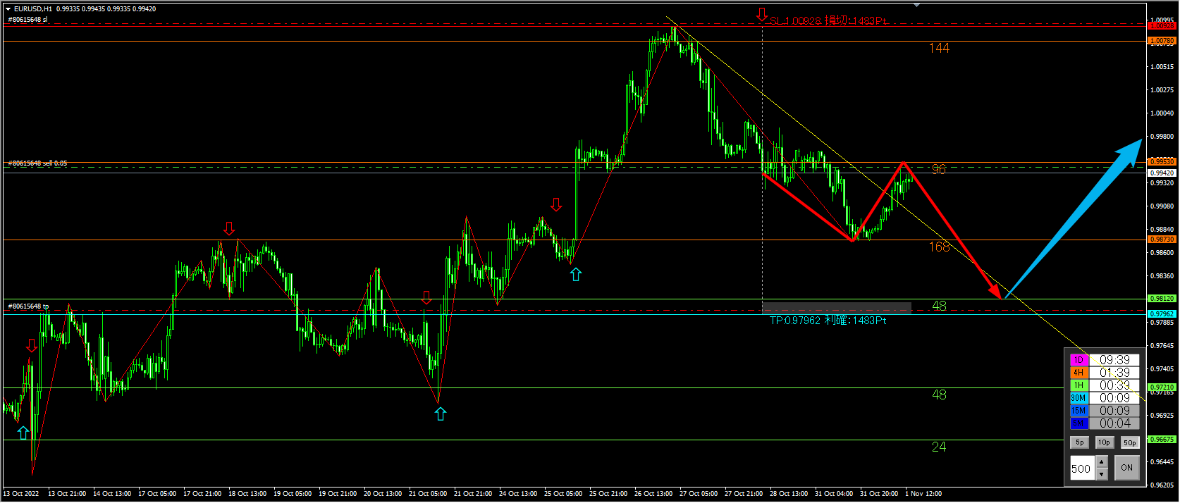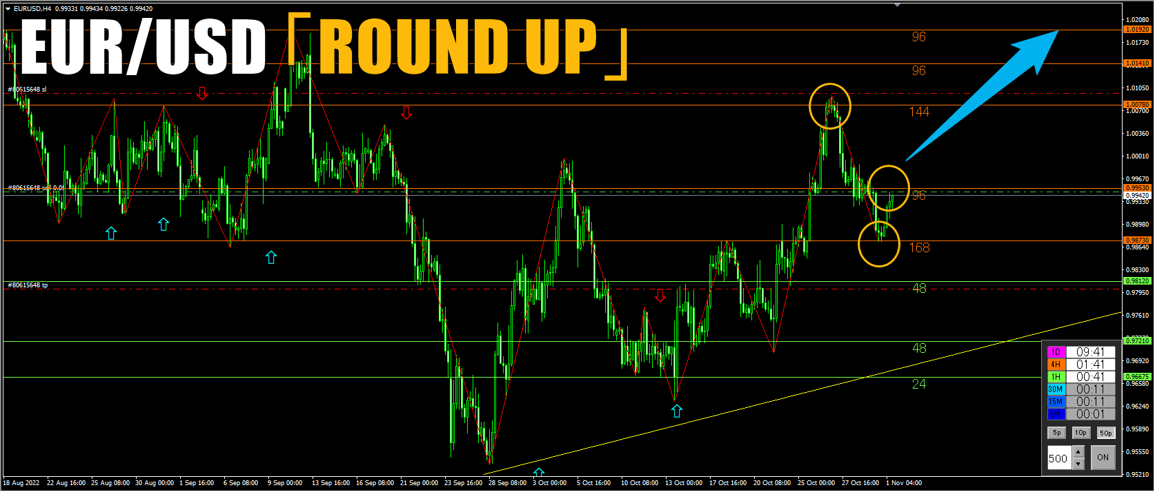 日足では上昇の流れに転換の形になっていますが、1時間足では押し目を付ける形でヘッドアンドショルダーの形を形成しているところに「ROUND UP」のサインがで出ました。