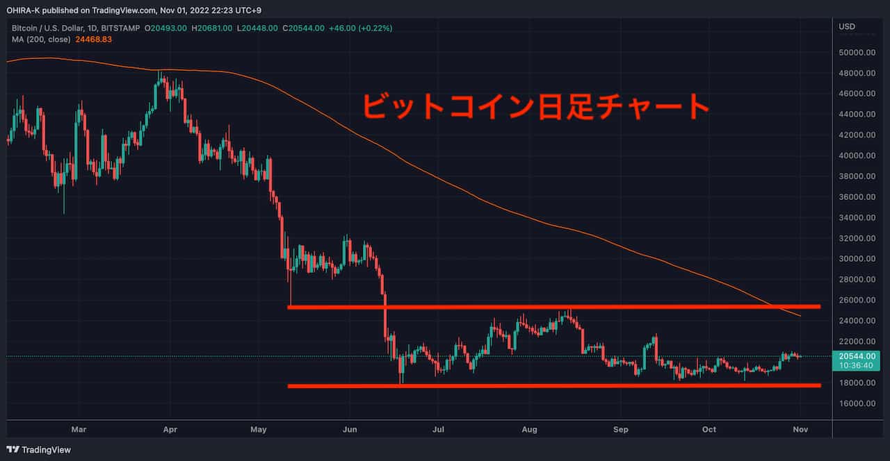 あと、26000ドルをもし超えた場合は、オレンジの200日移動平均線についても上に抜けそうです。米国は引き続き利上げを継続しており、今年中はレンジ内の動きが濃厚なのかもしれません。