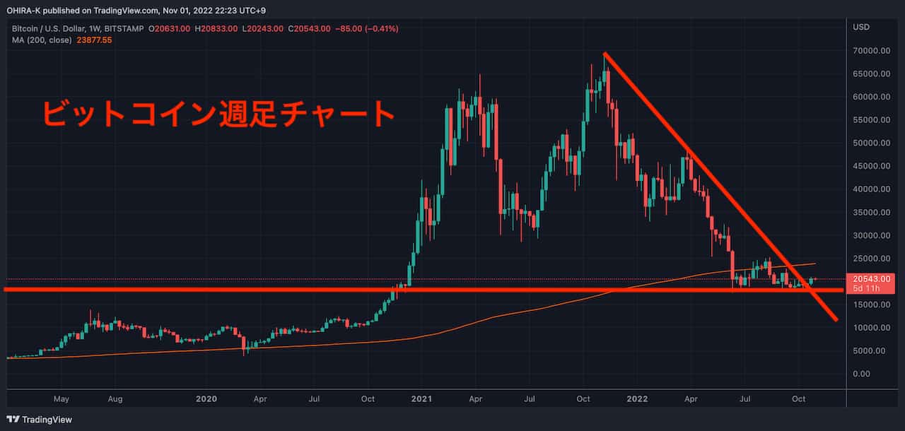 2017年のバブル時の最高価格(赤の水平ライン)がサポートとなって価格がとどまっている状況は継続しています。