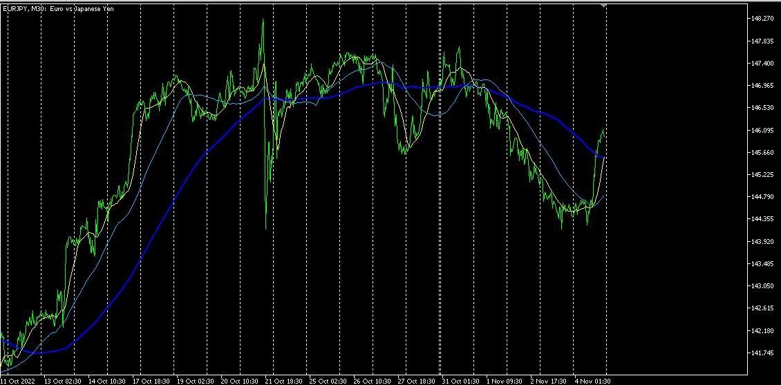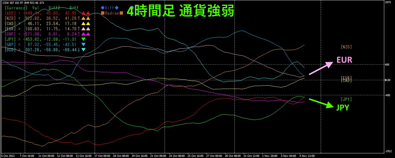 ピンク色がEUR、緑色がJPYです。EURは上向きに、JPYは下向きになっています。この結果、EURJPYは上昇すると予測されます。