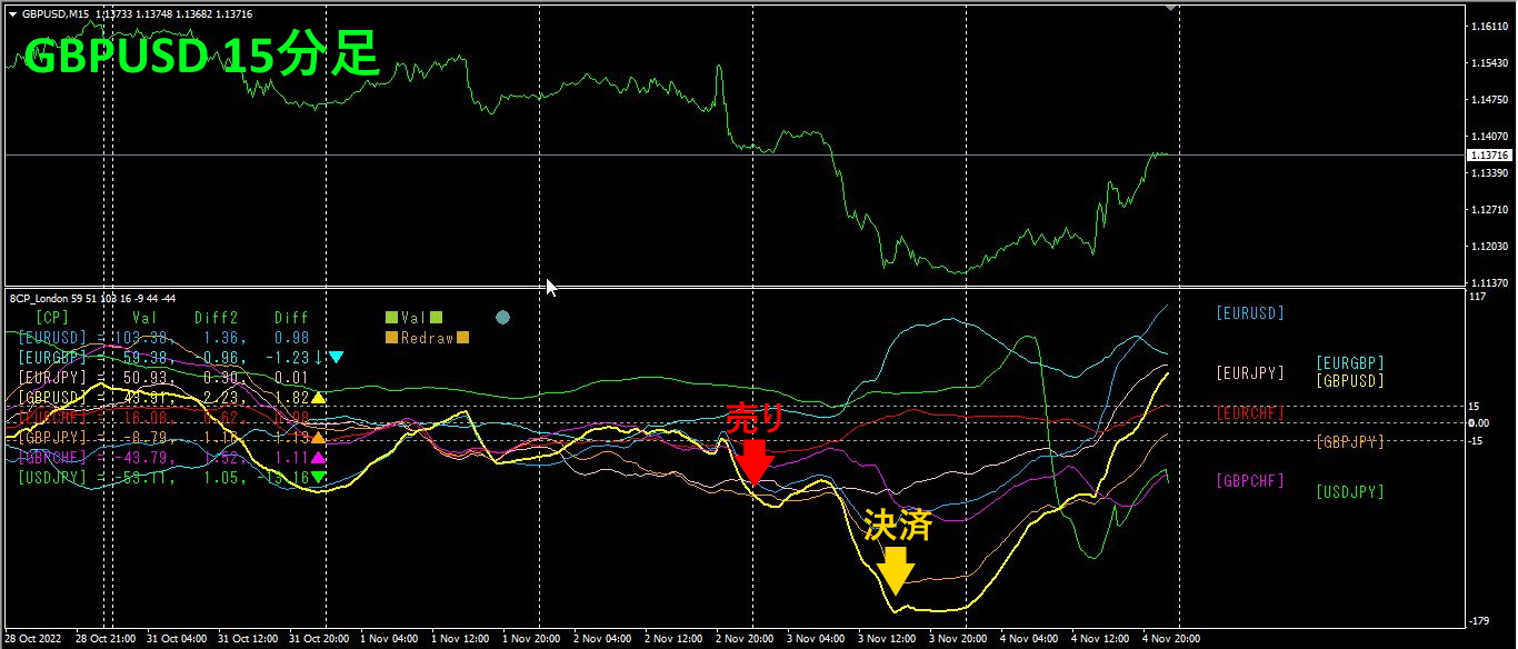 上半分は、GBPUSDの15分足チャートです。下半分は、「8CP見える化インジケータ」です。黄色太線のグラフがGBPUSDに相当します。